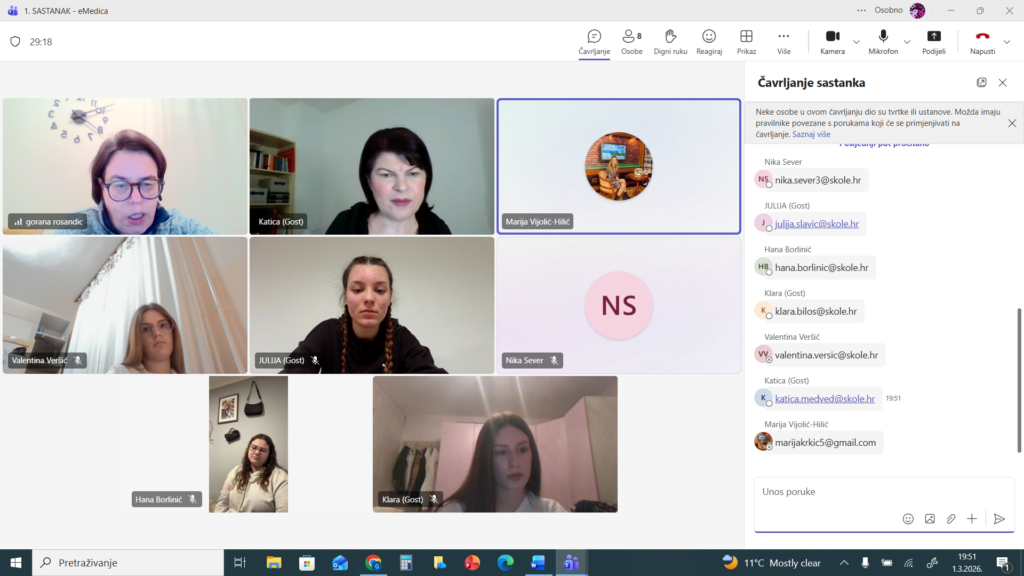 Na poziv mentorice škole nositeljice projekta, Biljane Balenović, 20. veljače 2026.godine održan je prvi sastanak učenika i mentora putem aplikacije Microsoft Teams.Sastanku su prisustvovali učenici i mentorice iz Medicinske škole Pula, Medicinskeškole Varaždin te Medicinske škole Bjelovar.Nakon kratkog predstavljanja i međusobnog upoznavanja, prešli smo na radni diosastanka. Dogovoreni su rokovi za izvršavanje predviđenih zadataka, definirane …